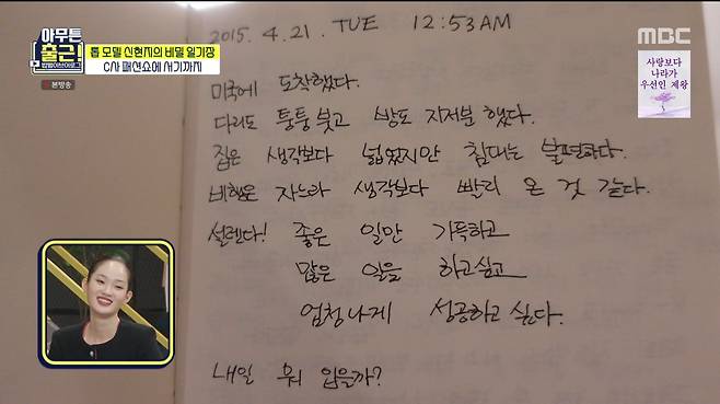 하루 일과를 마무리하며 일기를 작성한 신현지는 지난 2015년 4월 21일 미국에서 쓴 일기를 공개했다. 18세의 자신이 남긴 일기에는 고단함과 열정이 가득 담겨있었고, "처음에는 숙소가 없어서 모델 아파트에 살았다. 쇼 하나 서면 세상을 다 가진 기분이었다"면서 당시를 회상했다.