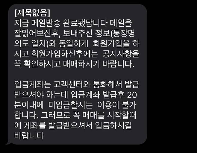 취재진도 BJ가 소개하는 핸드폰 번호로 문자를 보내봤습니다. 실시간 방송을 하는 와중에도 곧바로 답장이 왔습니다. 이메일 주소가 포함된 개인정보를 적어 보내자 곧바로 선물 거래를 할 수 있는 사설 HTS(홈트레이딩시스템) 프로그램을 보내옵니다. 입금 계좌를 만든 뒤 20분 이내에 송금하지 않으면 거래가 안 된다며 입금을 재촉하기도 했습니다.
