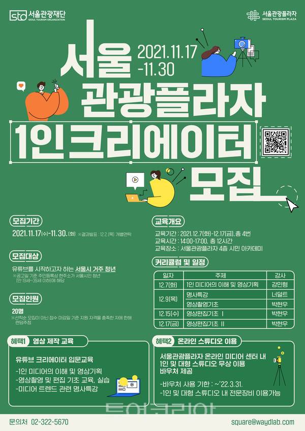 모집대상은 유튜브를 시작하고자 하는 서울시민 청년(만 19세~39세 이하) 대상 20명이며, 참가신청은 포스터의 QR코드 및 네이버폼(http://naver.me/506bBklv)을 통해 할 수 있다. 참가 대상 확정는 12월 2일 개별 발표될 예정이다.