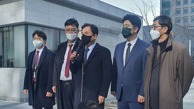 지검 정문 앞에서 김 위원장은 "이 후보를 변호사비 대납 의혹과 관련해 수사해달라는 내용의 고발장이 검찰에 접수된 지 한 달이 넘었는데도 수사는 미진한 상태"라며 "이번 고발 건은 이 후보 뇌물 수수 의혹의 급소와도 같은 만큼 대선 기간이 다가오기 전 신속한 수사를 촉구하기 위해 수원지검을 방문했다"고 말했습니다.