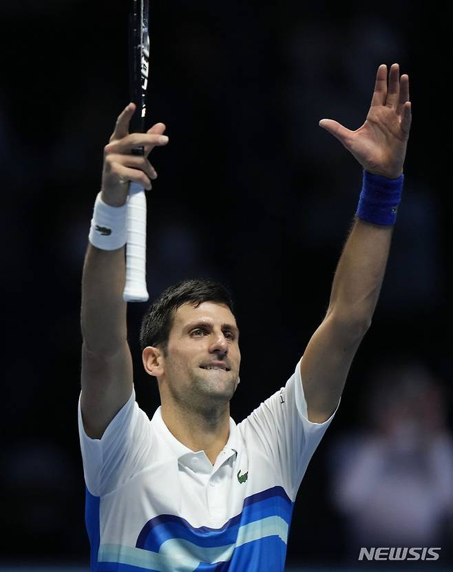 [토리노=AP/뉴시스] 노바크 조코비치(1위·세르비아)가 17일(현지시간) 이탈리아 토리노의 팔라 알피투어 경기장에서 열린 니토 2021 ATP 파이널스 단식 그린그룹 2차전에서 안드레이 루블레프(6위·러시아)를 꺾고 기뻐하고 있다. 조코비치는 루블레프를 세트스코어 2-0(6-3 6-2)으로 물리치고 2승을 기록했다. 2021.11.18.