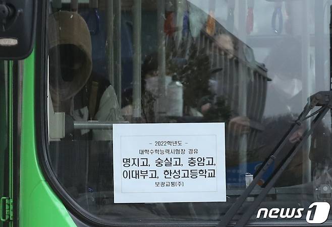 2022학년도 대학수학능력시험일인 18일 오전 서울 서대문구 이대부속 이화금란고등학교를 지나는 버스에 대학수학능력시험장 경유 학교를 안내하는 문구가 붙어 있다.
