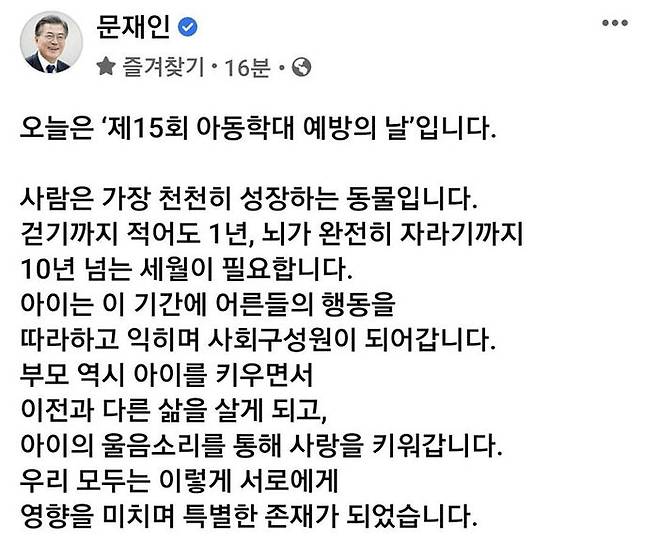 문 대통령은 오늘 소셜미디어에 남긴 글에서 "아이를 아끼고 존중하는 일은 곧 자신을 아끼고 존중하는 일"이라며 이렇게 적었습니다.