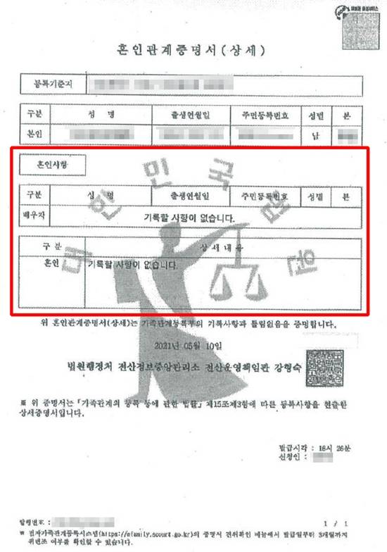 차일피일 혼인관계증명서 열람을 미루던 남자는 지난 5월 혼인관계증명서를 황보미에게 보여주었고, 황보미는 결혼과 이혼 내역 없이 깔끔한 혼인관계증명서를 확인한 후 남자와 다시 교제를 시작하였습니다. 당시의 황보미는 이것이 변조 문서임을 전혀 인지하지 못하였습니다.