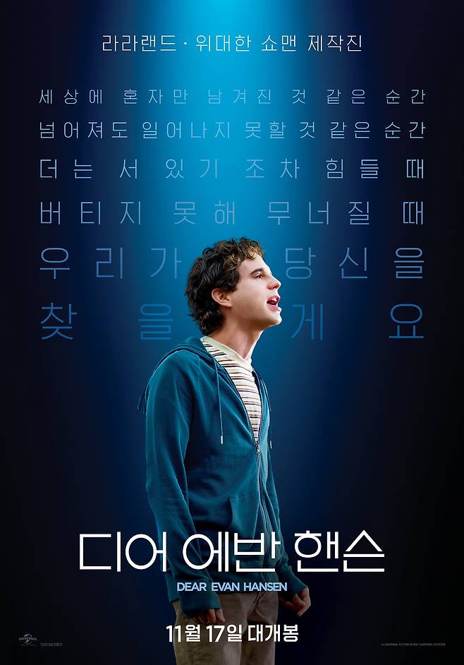 제71회 토니상에서 9개 부문에 노미네이트 되고 최고의 뮤지컬상을 포함 6개 부문 수상해 브로드웨이를 휩쓴 동명의 뮤지컬을 영상으로 옮긴 <디어 에반 핸슨>은 뮤지컬 영화 중에서도 독특한 포지션에 위치해 있다. 최근 몇 년간 큰 성공을 거둔 <라라랜드> <위대한 쇼맨> <알라딘>과 같은 작품에서 기대할 법한 시원한 노래와 화려한 춤과 퍼포먼스가 등장하는 작품이 아니기 때문이다.