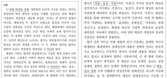 해당 지문을 보면, “헤겔에게서 절대정신의 내용인 절대적 진리는 본질적으로 논리적이고 이성적인 것이다” “직관의 외면성 및 예술의 객관성의 본질은 무엇보다도 감각적 지각성이다” “변증법에 충실하려면 헤겔은 철학에서 성취된 완전한 주관성이 재객관화되는 단계의 절대정신을 추가했어야 할 것이다” 등 고교생에겐 낯선 철학 개념과 어휘가 사용된 문장이 많았다. 수험생들이 시험장에서 빠른 시간 내에 읽고 이해하기엔 어려웠을 만한 내용이다.