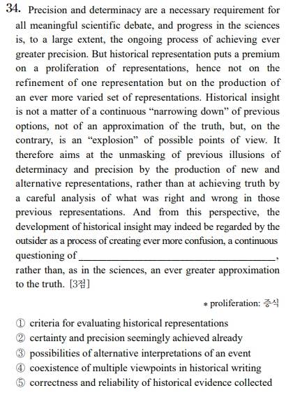 수험생들이 대표적 고난도 문제로 꼽은 홀수형 34번 문항의 경우 과학 지식과 역사학적 통찰은 그 성격이 다르다는 게 요지다. 과학 분야가 정확하고 확실한 진실 또는 하나의 정답을 찾기 위해 노력하는 학문이라면, 역사학은 확실하다고 생각했던 이전의 지식을 의문시하며 새롭고 대안적인 가설을 세우는 게 더 가치 있다는 얘기다. 인문학과 자연과학의 차이를 설명한 지문이었던 셈인데 많은 수험생은 “해설을 봤지만, 한국어로 들어도 모르겠다”고 푸념했다.