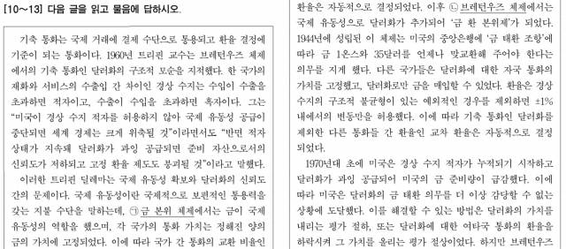 1945년 이후 국제 경제의 통화질서를 의미하는 ‘브레턴우즈 체제’와 기축통화국의 만성 적자가 필연적임을 지적하는 경제학 개념인 ‘트리핀 딜레마’를 주제로 한 비문학 지문도 고난도 문항으로 꼽혔다. 국제 거시경제에 관심 없는 이들이라면 처음 들어봤을 개념이기 때문이다.