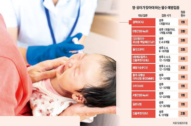 질병관리청에 따르면 신생아가 생후 12개월 안에 필수로 맞아야 하는 백신은 총 11개다. 주사를 맞는 횟수로 따지면 24번이다. ‘원샷원킬’이 아닌, 2~4회씩 맞아야 하는 백신이 있어서다.