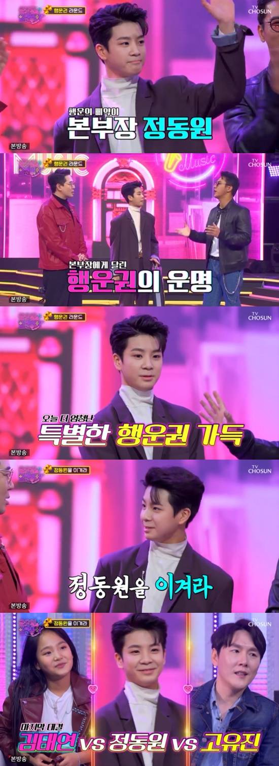 한편, 행운권 라운드는 '정동원을 이겨라'로 진행됐다. 정동원의 깜짝 등장에 멤버들은 "키가 언제 저렇게 컸냐"며 성장에 놀라워했다. 정동원은 고유진, 김태연과 노래방 대결을 펼쳤다. 정동원이 대결 곡으로 선정한 곡은 '잊어야 한다는 마음으로'였다.
