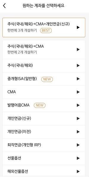 초반부터 고민스럽게 만드는 계좌 선택창. 주식 거래는 **주식(국내/해외)**라고 적힌 ‘종합주식거래계좌'만 있으면 가능합니다. 이때 증권사의 은행계좌격인 **CMA 계좌** 정도는 함께 만들기를 추천합니다. CMA 계좌는 은행 계좌보다 금리가 더 높고(저금리라 그게 그거긴 하지만) 1일 단위로 이자가 붙어서 단기 투자 자금을 보관하기에 적합하거든요. 저는 두번째 칸에 있는 '주식(국내/해외)+CMA' 계좌를 개설했습니다.