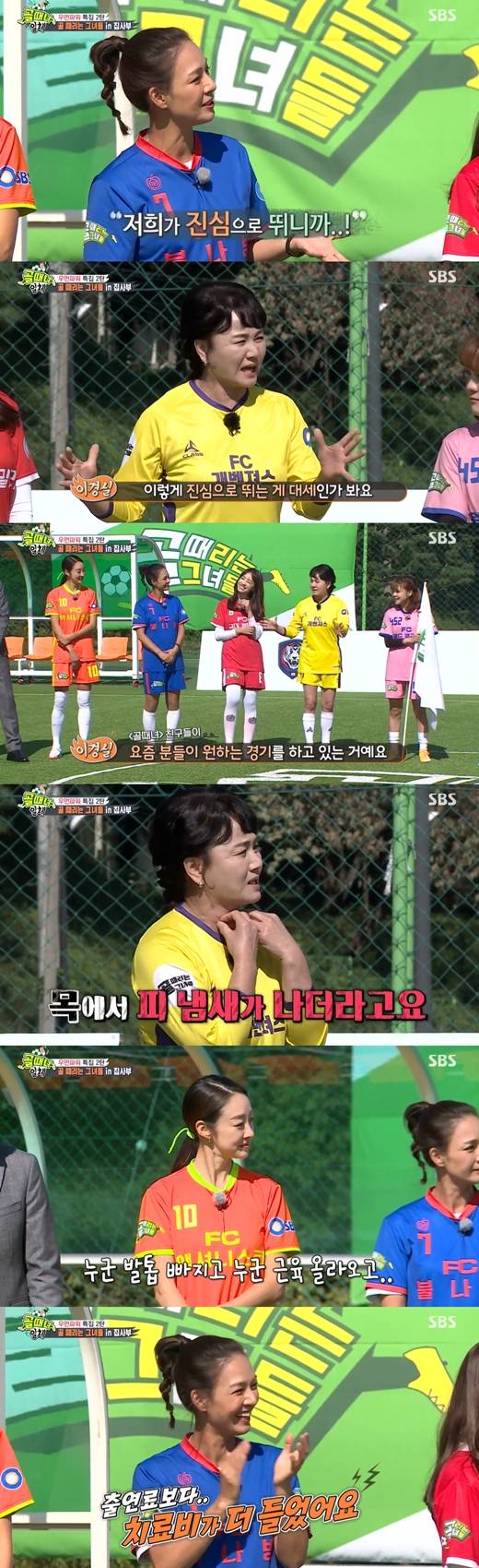 이경실은 "이렇게 진심으로 뛰는 것이 대세인가보다. 요즘 많은 분들이 원하는 경기를 이 사람들이 하고 있는 거다. 저는 파일럿 때 조금만 뛰니까 목에서 피맛이 났다"고 전했다.