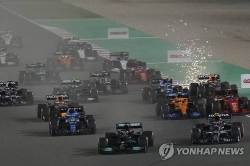 Mercedes driver Lewis Hamilton of Britain leads at the start of the Qatar Formula One Grand Prix. In Lusail, Qatar, Saturday, Nov. 21, 2021. (AP Photo/Darko Bandic)