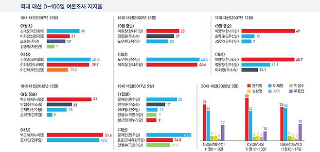 1997년 대선에서는 후보들이 난립했다. 선거 5개월 전인 7월까지도 여론조사에서 이회창 후보가 김대중 후보를 10%포인트 정도 앞서 나갔다. 하지만 8월 들어 불거진 이른바 '병풍(兵風·이 후보 아들의 병역 문제)'이 대선 판도를 바꿨다. 대선 D-100일을 앞둔 9월초 한국일보가 보도한 여론조사 결과를 보면 국민회의(민주당의 전신) 김대중 30%, 신한국당(국민의힘의 전신) 이회창 21%, 민주당 조순 17%, 자민련 김종필 7%로 각각 나타났다. 김대중 후보가 일단 기선을 잡은 모습이다.