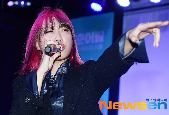 래퍼 이영지가 11월 22일 오후 서울 중구 서울시청 시민청에서 열린 서울홍보대사 위촉식에 참석해 무대를 펼치고 있다.