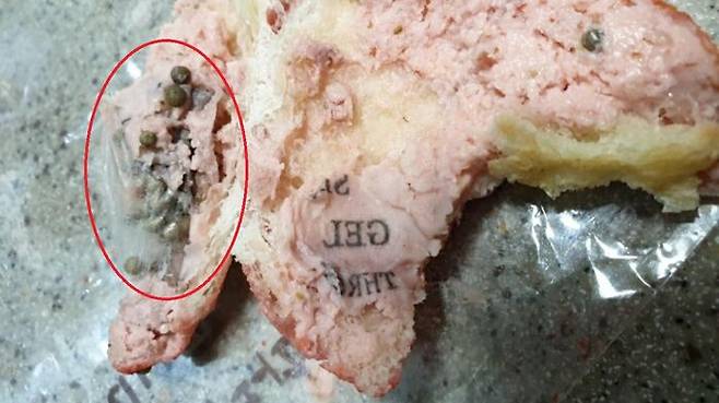 빵 속에는 비닐 포장에서 터져 나온 것으로 보이는 제습제 알갱이들이 들어 있었습니다.