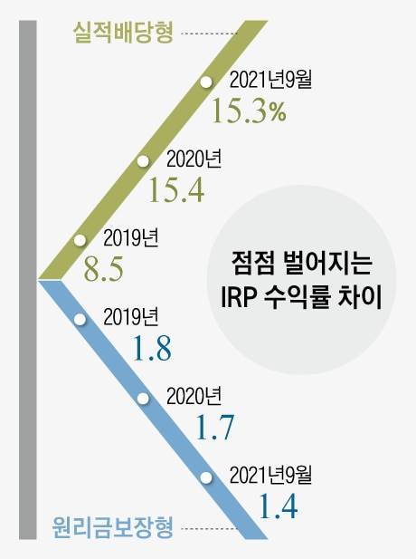 23일 신한금융투자가 IRP 계좌 3만2000개를 분석해 봤더니, 원리금보장형 IRP와 실적배당형 IRP의 수익률 격차가 지난 2019년 6.7%포인트에서 지난해 13.7%포인트, 올 9월엔 13.9%포인트로 커진 것으로 조사됐다. 같은 금융회사에서 IRP를 가입했다고 해도 어떤 유형을 선택했느냐에 따라 수익률 격차가 나타난 것이다. 원리금보장형 IRP는 예⋅적금, 채권 등에 투자하는 안정형 상품이고 실적배당형은 펀드·리츠·ETF 등에 투자한다.