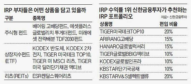 실적배당형 IRP로 고수익을 올린 연금 부자들은 어떤 상품으로 운용하고 있을까. 신한금융투자 분석에 따르면, IRP 부자들은 주식처럼 상장되어 실시간 거래되는 상장지수펀드(ETF)를 선호했다. ETF는 실적배당형 상품이므로 원금 손실 가능성은 있지만 개별 종목보다는 덜 위험하고 수수료가 저렴하며 소액으로 매수할 수 있다는 것이 장점이다.