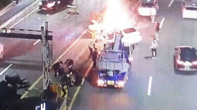 부산에서 중앙분리대를 들이받고 불이 난 차량에 지나가던 시민들이 달려들어 운전자를 구해냈습니다. 불길이 치솟는 상황이었는데도 시민들은 정말 용감했습니다.
