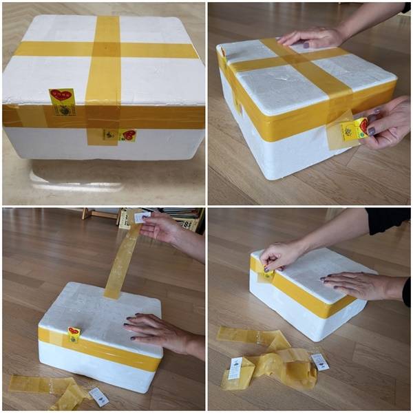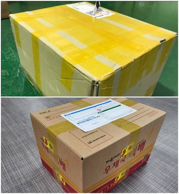 | ▲ 택배상자에 덕지덕지 붙은 테이프(위)와 심플한 하트테이프(아래) 모습 |