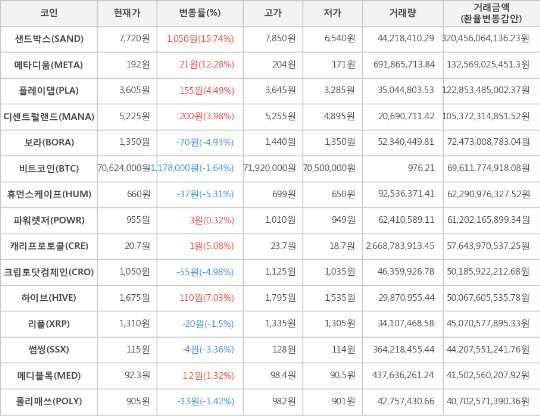상승세를 보이는 가상화폐는 총 8종목으로 이 중 가장 큰 상승세를 보이는 샌드박스는 전일 대비 15.74% 상승한 7,720원에 거래되고 있다.