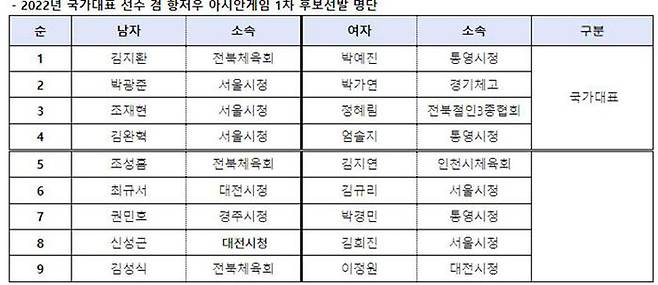 2022년 국가대표 외에 남자부 조성흠(전북체육회), 최규서(대전시청), 권민호(경주시청), 신성근(대전시청), 김성식(전북체육회), 여자부 김지연(인천시체육회), 김규리(서울시청), 박경민(통영시청), 김희진(서울시청), 이정원(대전시청)이 항저우 아시안게임 대표 선발전 출전 기회를 얻었습니다.