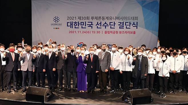 2021 루체른 동계 유니버시아드(U대회)에 출전하는 대한민국 선수단의 결단식이 24일 오후 서울 송파구 방이동 올림픽 공원 내 뮤즈 라이브홀에서 열렸습니다.