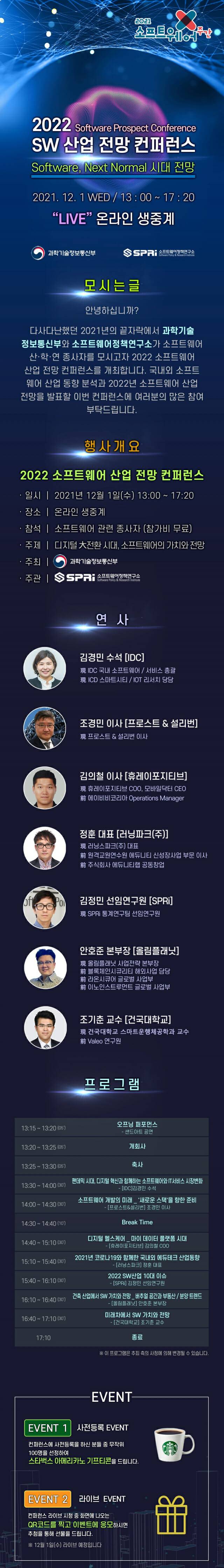 한편, 행사 개최에 앞서 사전등록 및 라이브 이벤트도 진행한다. 컨퍼런스에 사전등록한 사람 중 추첨을 통해 100명에게 음료 상품권을 증정하고, 라이브 시청 중 화면에 나오는 QR코드를 찍어 이벤트에 응모하면 추첨을 통해 특별 선물을 준다. 행사와 관련한 자세한 사항은 소프트웨어정책연구소(SPRI) 홈페이지에서 확인할 수 있다.