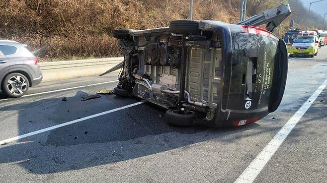 오늘(25일) 오전 11시 40분쯤 충북 괴산군 장연면 중부내륙고속도로 장연터널 입구에서 1차로를 달리던 승합차가 가드레일을 들이받고 뒤집어졌습니다.