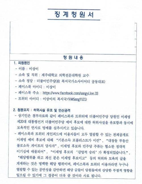 공개된 청원서에는 '이 교수가 이 후보에 대해 기본 소득 포퓰리스트, 대장동 부동산 불로소득 게이트의 당사자 등의 표현으로 허위사실을 유포해 인신 공격을 했다'는 주장이 기재됐습니다.