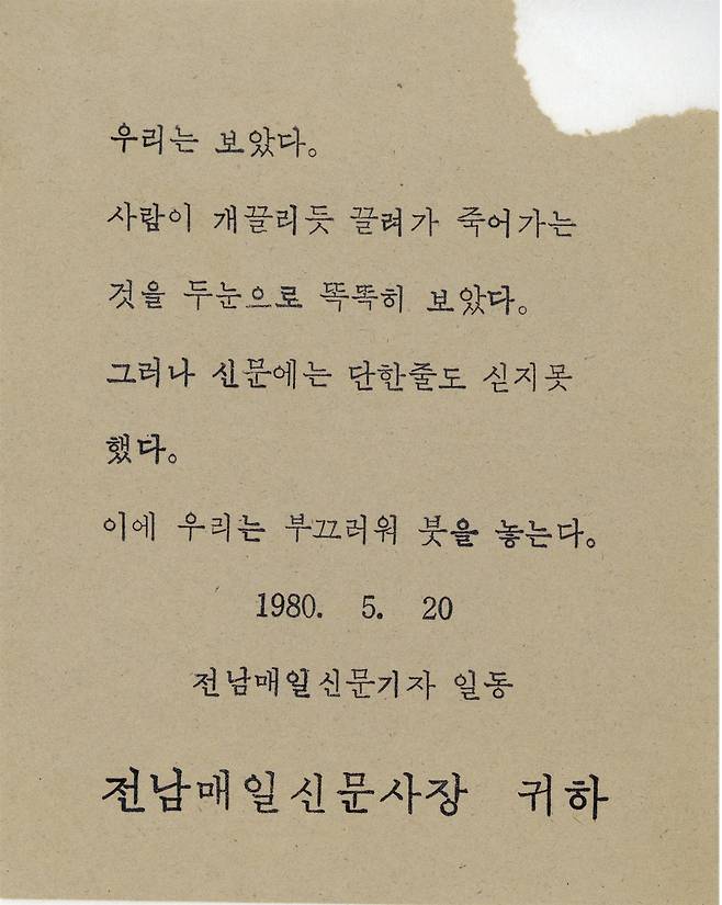 우리는 보았다 / 사람이 개 끌리듯 끌려가 죽어가는 것을 / 두 눈으로 똑똑히 보았다. / 그러나 신문에는 단 싣지 못했다. / 이에 우리는 부끄러워 붓을 놓는다. - 1980년 5월 20일 전남매일신문 기자 일동