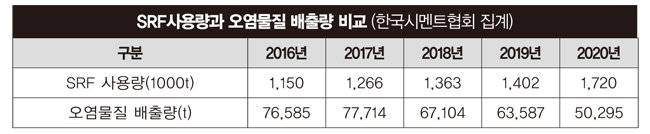 반면 시멘트 소성 공정에 폐기물 연료 사용량이 늘어날수록 대기오염물질 배출량은 오히려 줄어든다는 연구 결과도 있다. 협회 집계에 따르면, 2017년 SRF 사용량은 126만6000t, 오염물질 배출량은 7만7714t이었다. 2018년에는 SRF 사용량은 136만3000t으로 9만7000t 늘었고, 오염물질 배출량은 6만7104t으로 1만610t 줄었다. 2019년에는 SRF 사용량이 140만2000t으로 늘었고, 오염물질 배출량은 6만3587t으로 줄었다. 지난해에는 SRF 사용량이 172만t, 오염물질 배출량은 5만295t을 기록했다.