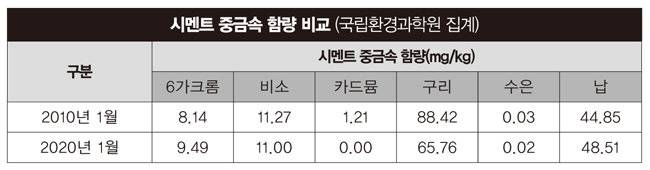폐기물 재활용 원료가 거의 쓰이지 않던 2010년 생산된 시멘트의 kg당 중금속 함량(mg)은 평균 153.92mg(△6가크롬 8.14mg △비소 11.27mg △카드뮴 1.21mg △구리 88.42mg △수은 0.03mg △납 44.85mg)였지만, 지난해 재활용 원료를 넣어 생산한 시멘트의 중금속 함량은 평균 134.78mg(△6가크롬 9.49mg △비소 11.00mg △카드뮴 미검출 △구리 65.76mg △수은 0.02mg △납 48.51mg)로, 어린이 놀이터에 쓰이는 모래의 중금속 허용치보다 적었다(놀이터 모래의 중금속 허용 기준은 납 200mg 이하, 비소 25mg 이하, 카드뮴 4mg 이하, 수은 4mg이하. 구리 관련 허용치 기준은 없음).