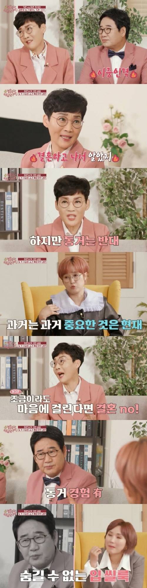 팽현숙은 "동거를 하다 이어진 게 아니라 결혼할까 말까 고민인 것이다. 그러면 솔직히 터놓고 말하는 게 좋겠다. 이걸 다 극복할 수 있으면 결혼하는 거다. 신경 쓰이면 포기하는 게 나을 것 같다"라고 조언했다.