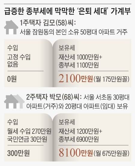 월세 받을 용도로 집 한 채를 더 마련해둔 은퇴족들은 작년보다 수십 배 오른 종부세에 그야말로 ‘패닉’ 상태다. 서울 노원구에 사는 70대 은퇴자는 “강남 아파트 한 채 값도 안 되는 집 2채 있다고 작년 3만원이었던 종부세가 183만원으로 올랐다”며 “월세 수입이 다 세금으로 들어가면 무슨 돈으로 생활하느냐”고 말했다. 1980년대에 장만한 상가주택에 살던 임모(82)씨는 “남편과 사별하고 좀 편하게 살겠다고 소형 아파트를 하나 장만했는데, 2000만원 넘는 종부세 고지서가 나왔다”며 “돈을 마련할 방법은 없고, 자식들한테 말도 못한 채 속만 끓이고 있다”고 했다.