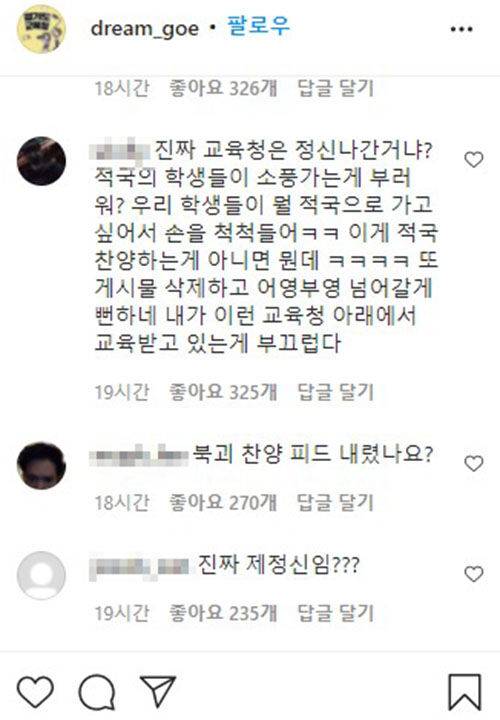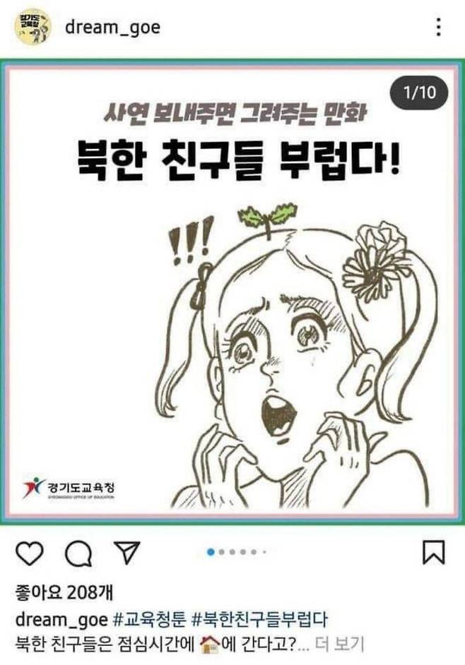 지난 26일 경기도교육청의 공식 인스타그램에는 '사연 보내주면 그려주는 만화-북한 친구들 부럽다'라는 제목의 웹툰 한 편이 공개됐습니다. 해시태그에는 '#교육청툰' '#북한 친구들 부럽다'가 덧붙여졌습니다.