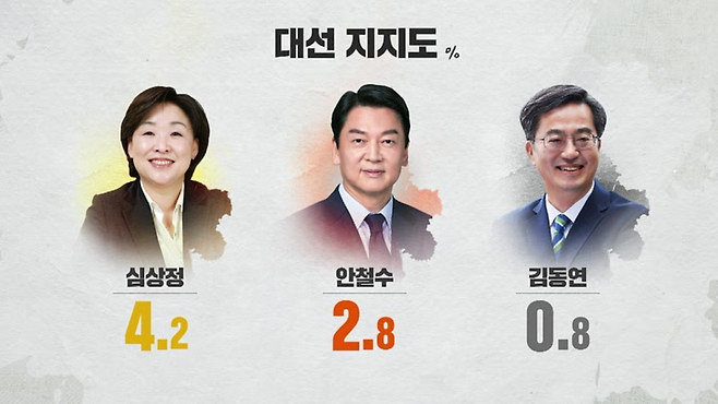 정의당 심상정 4.2%, 국민의당 안철수 후보 2.8%, 김동연 전 경제부총리는 0.8%였습니다.