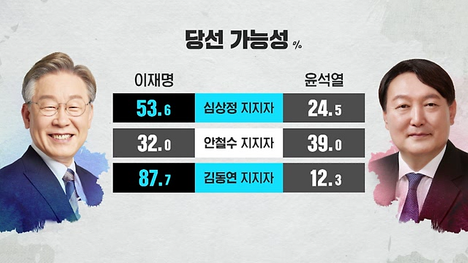 제3지대 지지층을 보면, 심상정, 김동연 지지층은 이재명, 안철수 지지층은 윤석열 당선 가능성이 더 크다고 봤습니다.