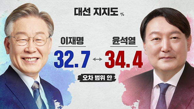 민주당 이재명 32.7%, 국민의힘 윤석열 후보 34.4%로, 격차는 1.7%포인트, 박빙입니다.