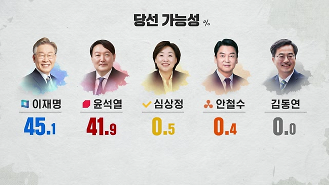 자신의 지지 여부와는 상관없이 당선될 가능성이 가장 큰 후보를 물었더니, 이재명 45.1%, 윤석열 41.9%로 경합 상태였습니다.