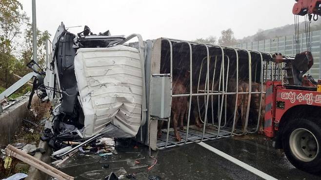 이 사고로 소 4마리를 수송하던 화물차가 운전석 방향으로 전도돼 운전사 A(61)씨가 현장에서 숨졌습니다.