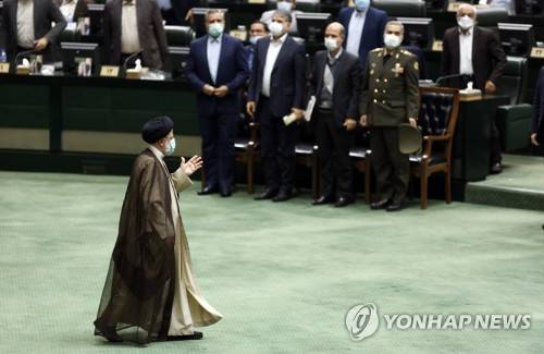epa09614072 Iranian President Ebrahim Raisi (C) gestures as leaves the podium after he delivered his speech, during a parliament session on the occasion of Parliament Day, at the Iranian parliament in Tehran, Iran, 01 December 2021. Iranian officials state that they are looking for a good, positive nuclear deal in Vienna which will lead to the lifting the of sanctions against the nation. Iran and world powers resumed nuclear talks in Vienna, Austria on 29 November 2021. EPA/ABEDIN TAHERKENAREH