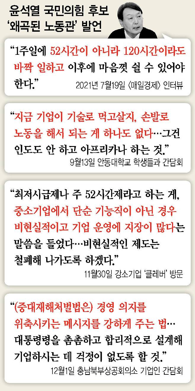 윤석열 국민의힘 대선 후보가 “52시간제·최저시급이 비현실적”이라는 주장에 동조한 데 이어 1일 “중대재해처벌법이 기업인들의 경영 의지를 위축시킨다”고 말했다. 정치 입문 뒤 이어지고 있는 ‘왜곡된 노동관’을 보여주는 윤 후보의 발언에 정치권 안팎의 비판이 쏟아지고 있다.