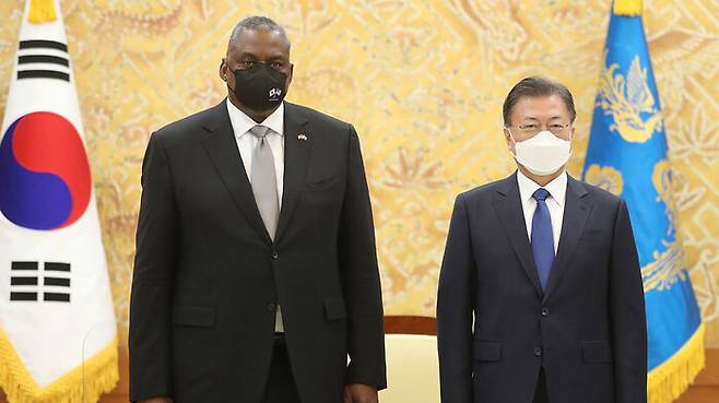 문재인 대통령은 로이드 오스틴 미국 국방장관에게 한반도 종전선언을 위한 미국의 지속적인 관심과 지지를 당부했습니다.