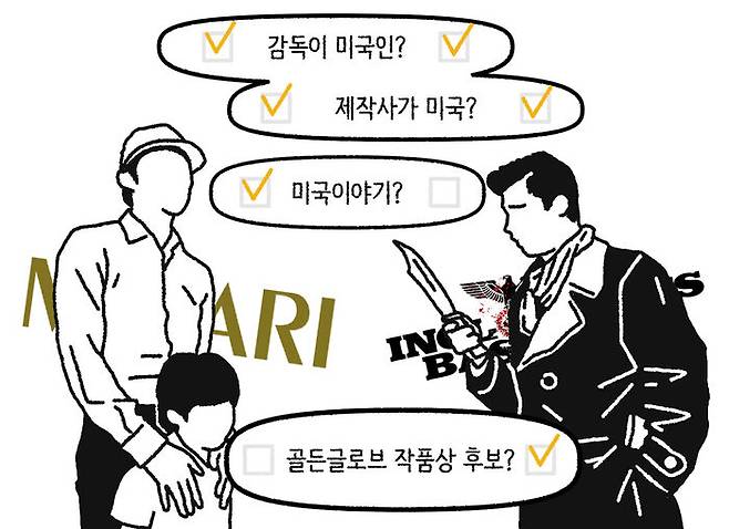 내용도 이민자에 대한 이야기라 지극히 미국적인 영화라는 평가를 받았던 이 영화가 골든글로브 시상식에선 외국어영화상 후보에 올랐습니다. 작품성을 인정받았지만 외국어영화라는 명찰을 받게 되면서 작품상 후보에는 오르지 못하게 됐죠. 외국어영화상 후보에 오른 이유는? 대사의 대부분이 한국어라서! 골든글로브 시상식 규정에는 대사의 50% 이상이 영어인 영화만 작품상에 오를 수 있다는 규정이 있다는 겁니다.
