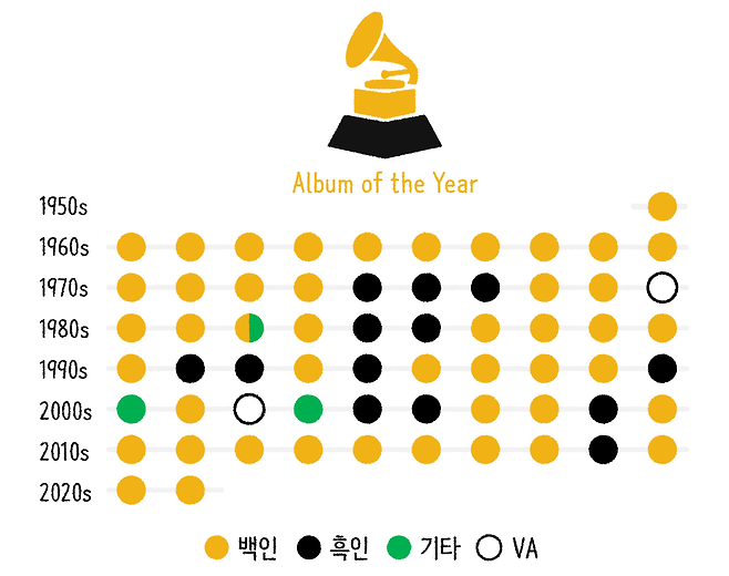 도대체 얼마나 닫혀있길래 이런 이야기가 나오는지 한 번 데이터로 살펴볼게요. 미국에서 발매되는 모든 레코드들을 대상으로 최고의 앨범을 뽑는, 올해의 앨범상 데이터를 가지고 시각화를 해봤습니다. VA(Various Artists)로 표시된 앨범은 OST 앨범이고요. 1959년부터 2021년까지 총 63회의 그래미 올해의 앨범 수상 실적부터 살펴보면 흑인 아티스트 단독으로 수상한 경우는 13회입니다. 46건은 모두 백인 아티스트가 포함되어 있죠. 후보까지 포함하면 총 424명의 아티스트 중에 백인은 336명으로 79.2%를 차지합니다. 흑인은 76명으로 17.9%였어요.