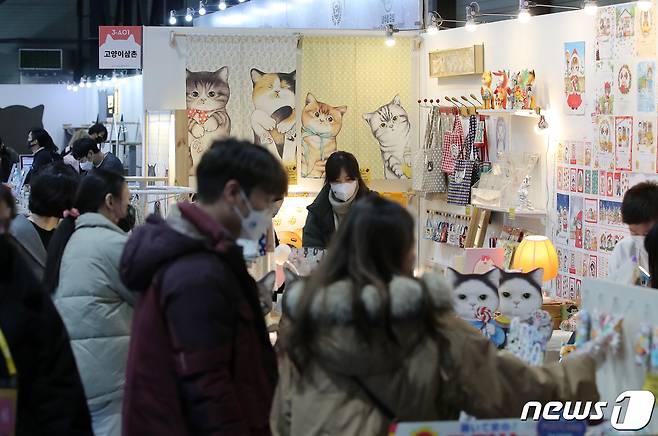 (서울=뉴스1) 김진환 기자 = 3일 오후 서울 강남구 SETEC에서 열린 궁디팡팡 캣페스타에 관람객들이 고양이 용품을 구매하고 있다. 2021.12.3/뉴스1
