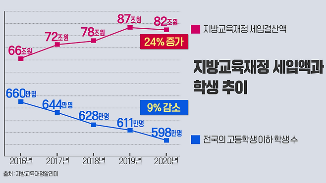실제로 교육재정은 2016년 66조, 2017년 72조, 2018년 78조, 2019년 87조, 2020년 82조로 5년 동안 24% 증가했습니다.