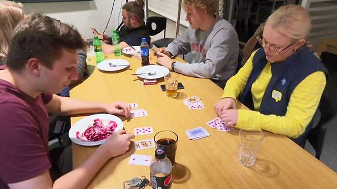 사람들이 탁자에 둘러앉아 음식을 먹으면서 카드 게임을 하거나 TV로 축구 경기를 봅니다.