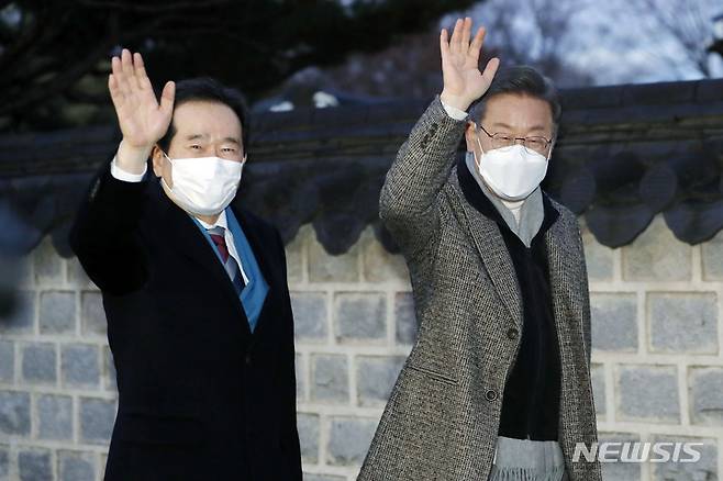 [전주=뉴시스] 최동준 기자 = 이재명 더불어민주당 대선 후보가 3일 전북 전주 한옥마을 종로회관에서 정세균 전 국무총리와 만찬을 하기 위해 걸어오고 있다. 2021.12.03. photocdj@newsis.com